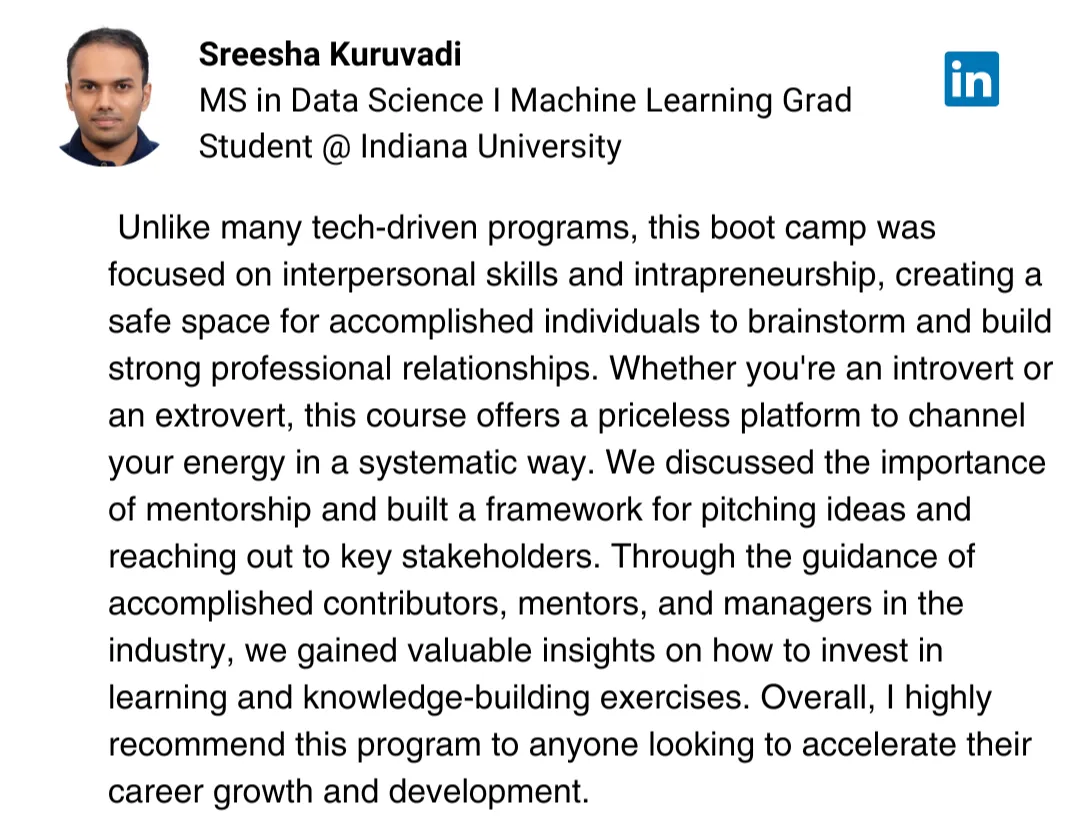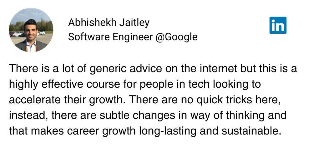 Most people joining this are usually already doing great. Students have reported faster promotion (6-18 months faster), changing to a higher leverage role, and lasting change. I cover very advanced-level stuff in the workshop and help you discover your high-leverage superpowers. If you are ambitious, you will get a lot out of this workshop.